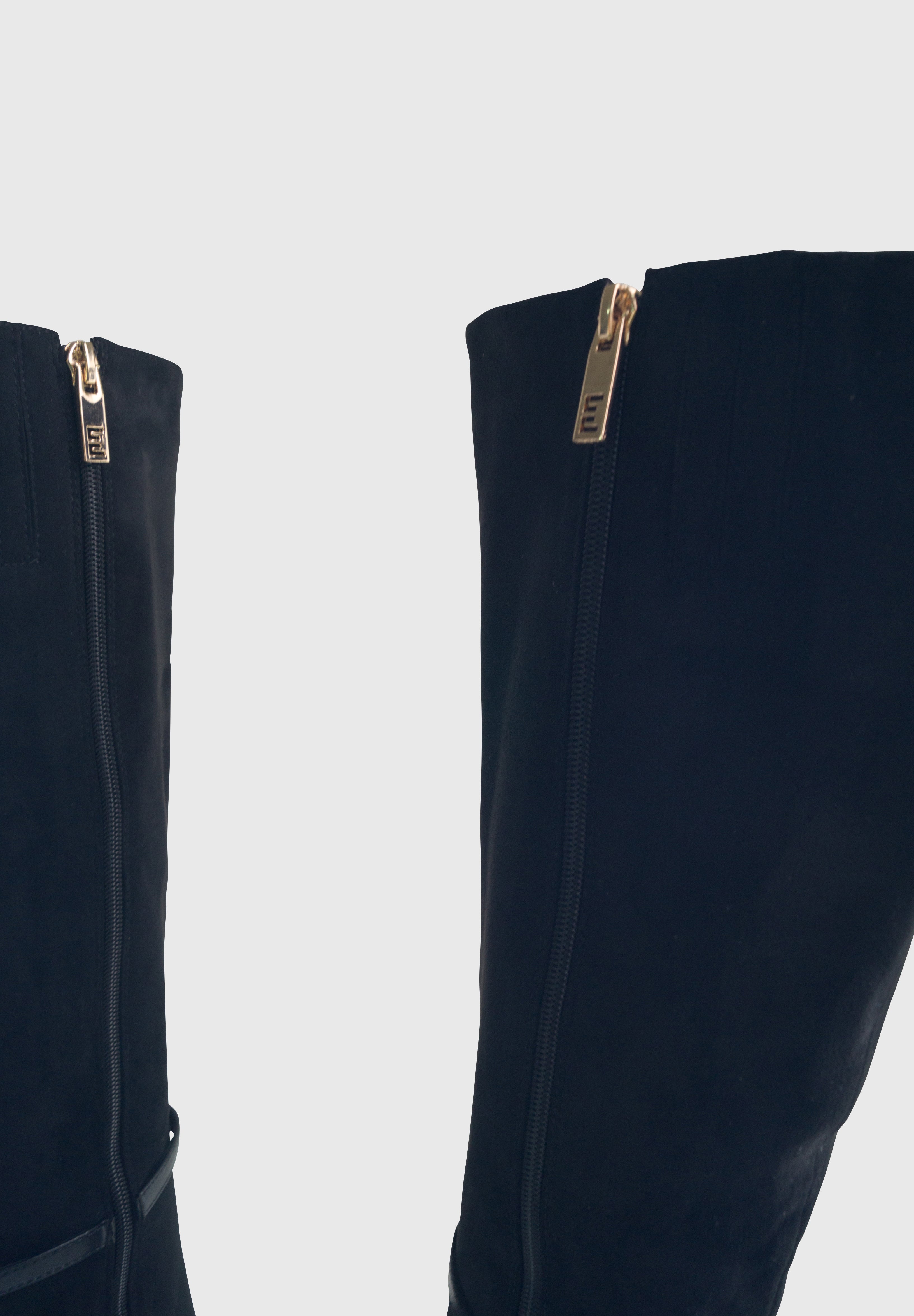 Con il loro plateau elevato e il tacco largo e angolare, offrono una silhouette slanciata e decisa. La combinazione di punta, tacco e plateau in similpelle si armonizza perfettamente con la tomaia in camoscio, creando un look sofisticato e di tendenza. Un dettaglio distintivo è il bracciale in similpelle con logo dorato, in caviglia, che impreziosisce la parte superiore degli stivali. Come tutti i modelli ENPOSH, questi stivali includono un plantare in memory foam per il massimo comfort.