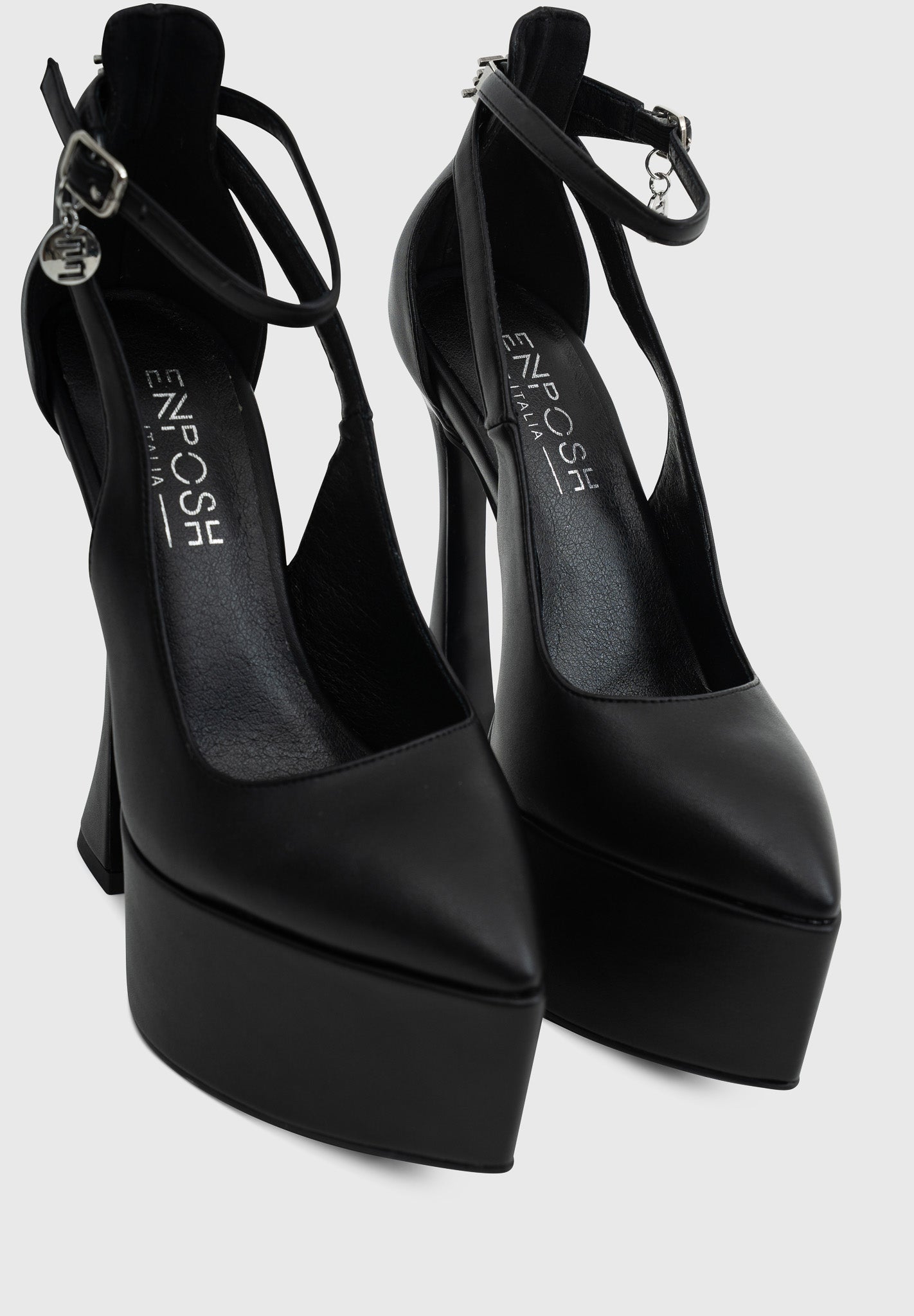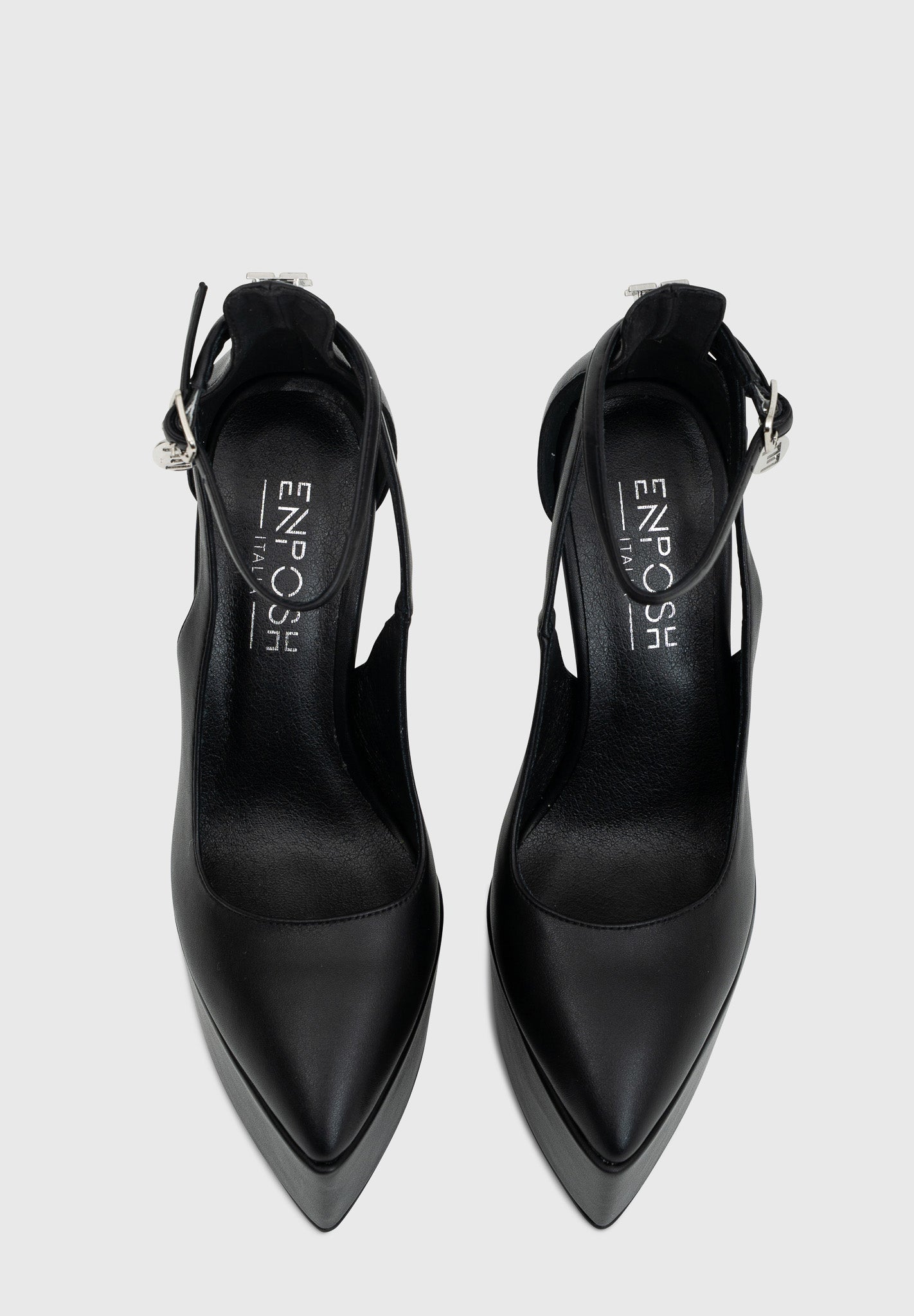 These platform pumps combine clean lines with the bold character of the hourglass heel, an iconic element of the capsule collection. The pointed toe elongates the silhouette while the ankle strap with ENPOSH charm frames the foot with an elegant detail.