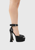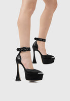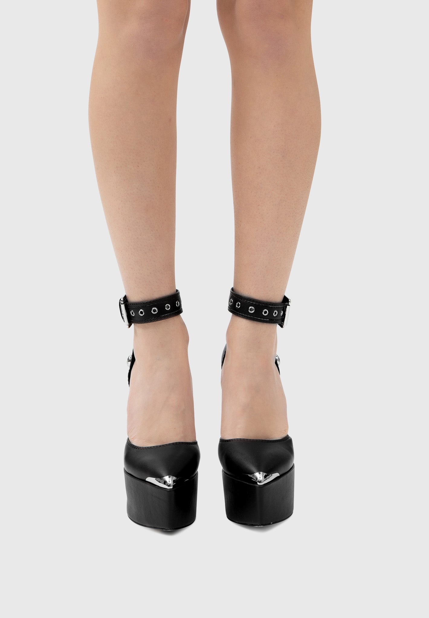 Realizzata in morbida similpelle vegana nero, scolpisce la silhouette con un tacco alto a clessidra dal profilo scultoreo e un maxi plateau che alleggerisce l’inclinazione del piede. La punta è illuminata da un dettaglio metallico argento che cattura la luce e rende la scarpa protagonista di qualsiasi outfit elegante.