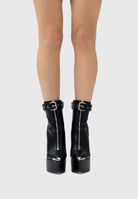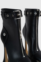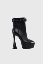 La tomaia in similpelle vegana premium in colore nero avvolge la caviglia con linee pulite, mentre il cinturino regolabile con fibbia e occhielli metallici aggiunge un tocco grintoso e moderno.