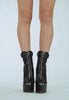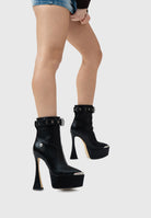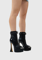 Il tacco a clessidra, slanciato e scultoreo, incontra il maxi plateau che dona altezza e stabilità, rendendo ogni passo audace ma sicuro.