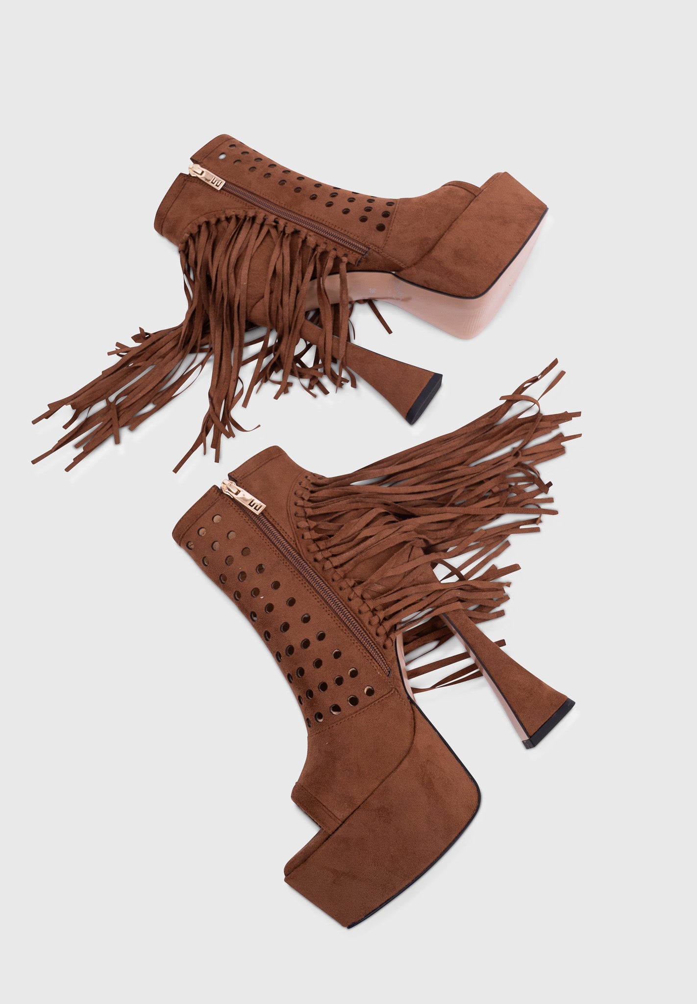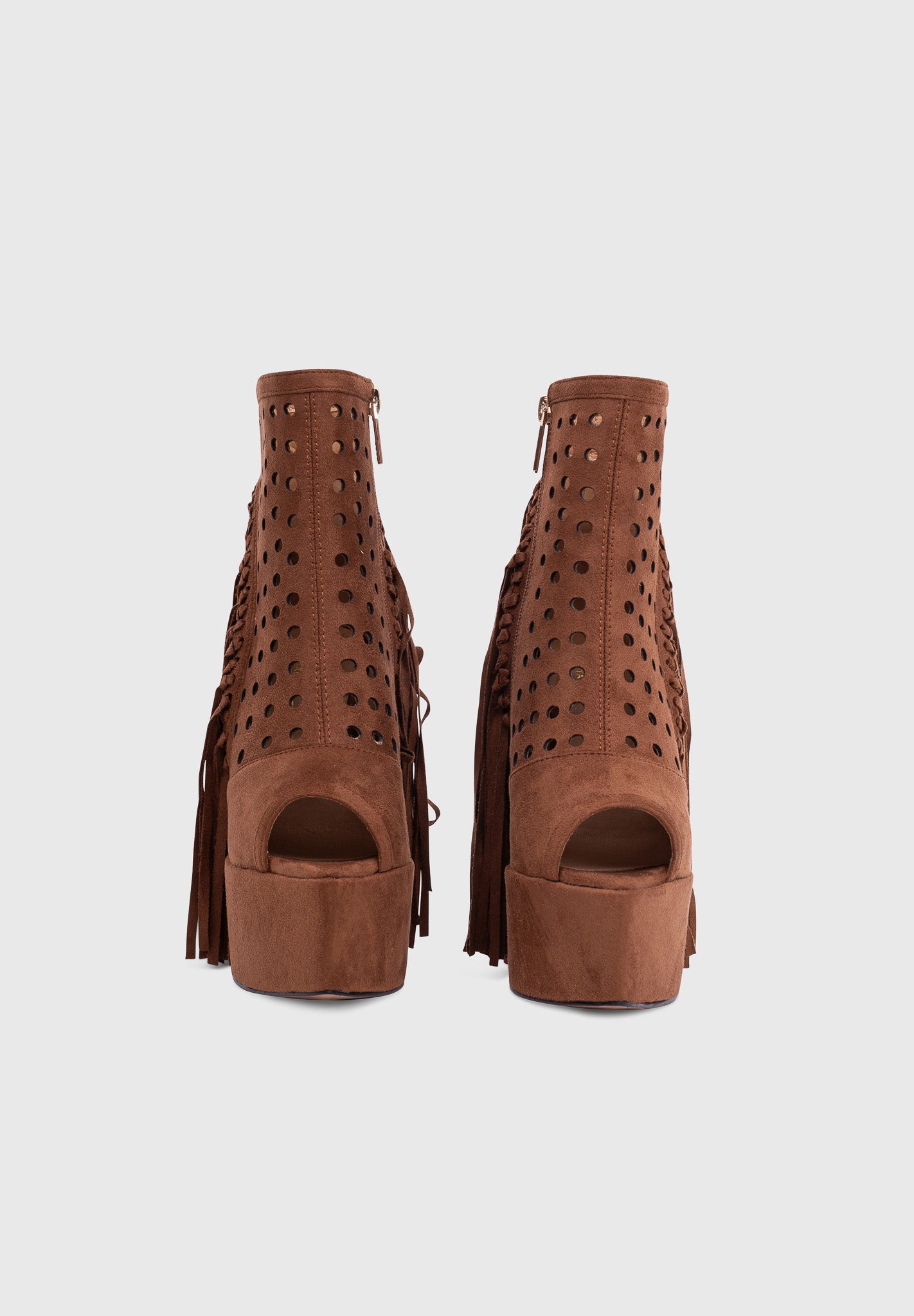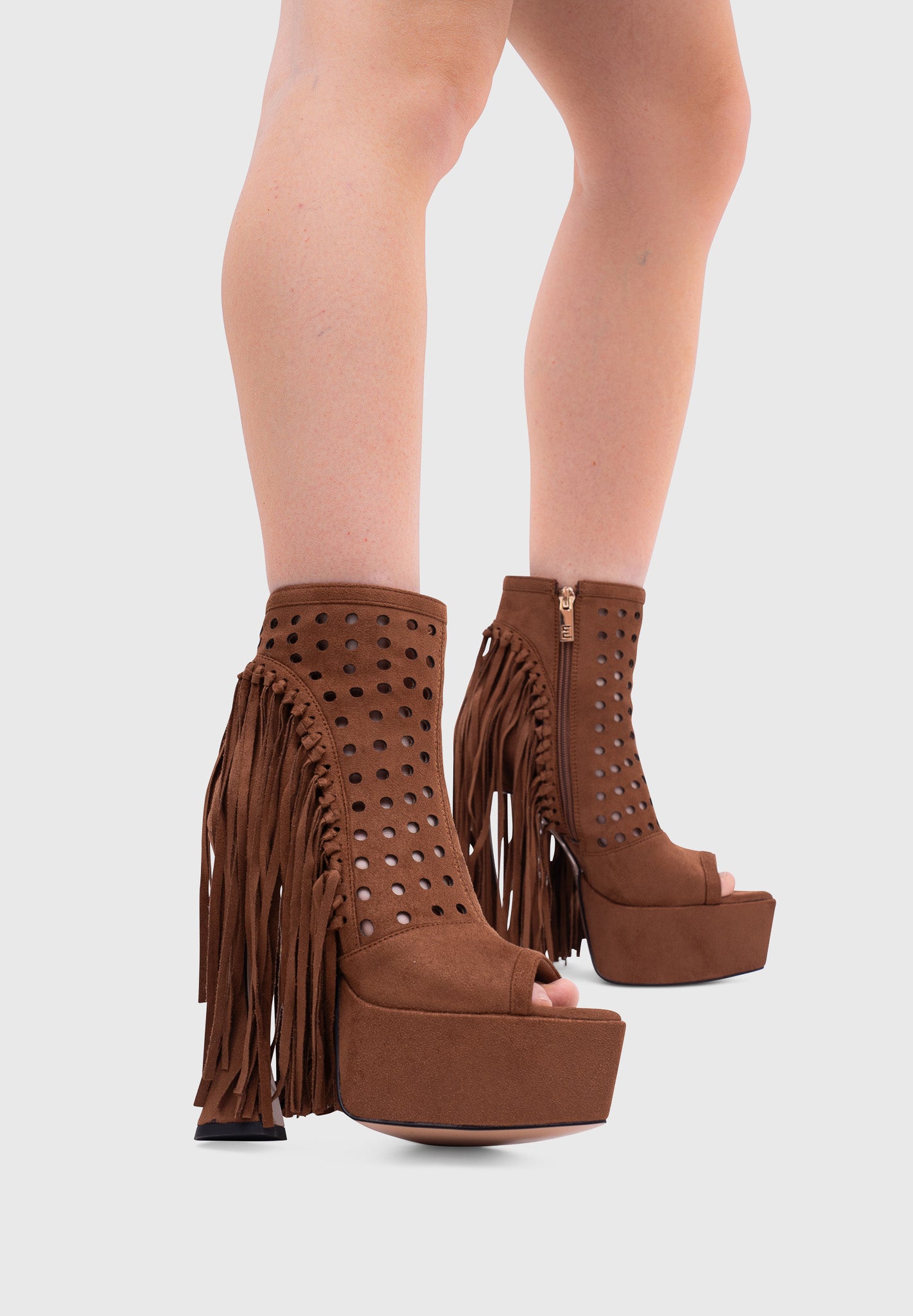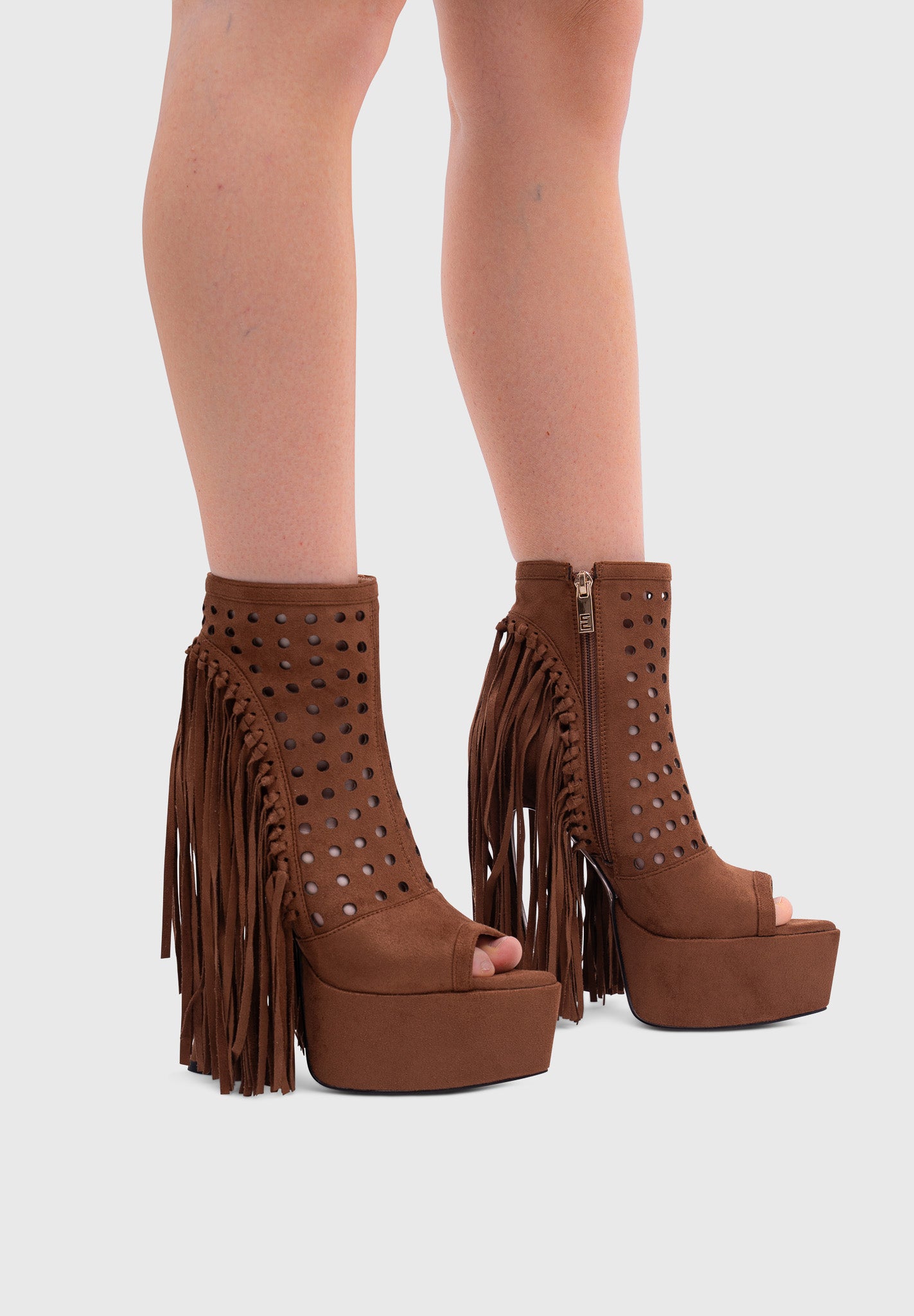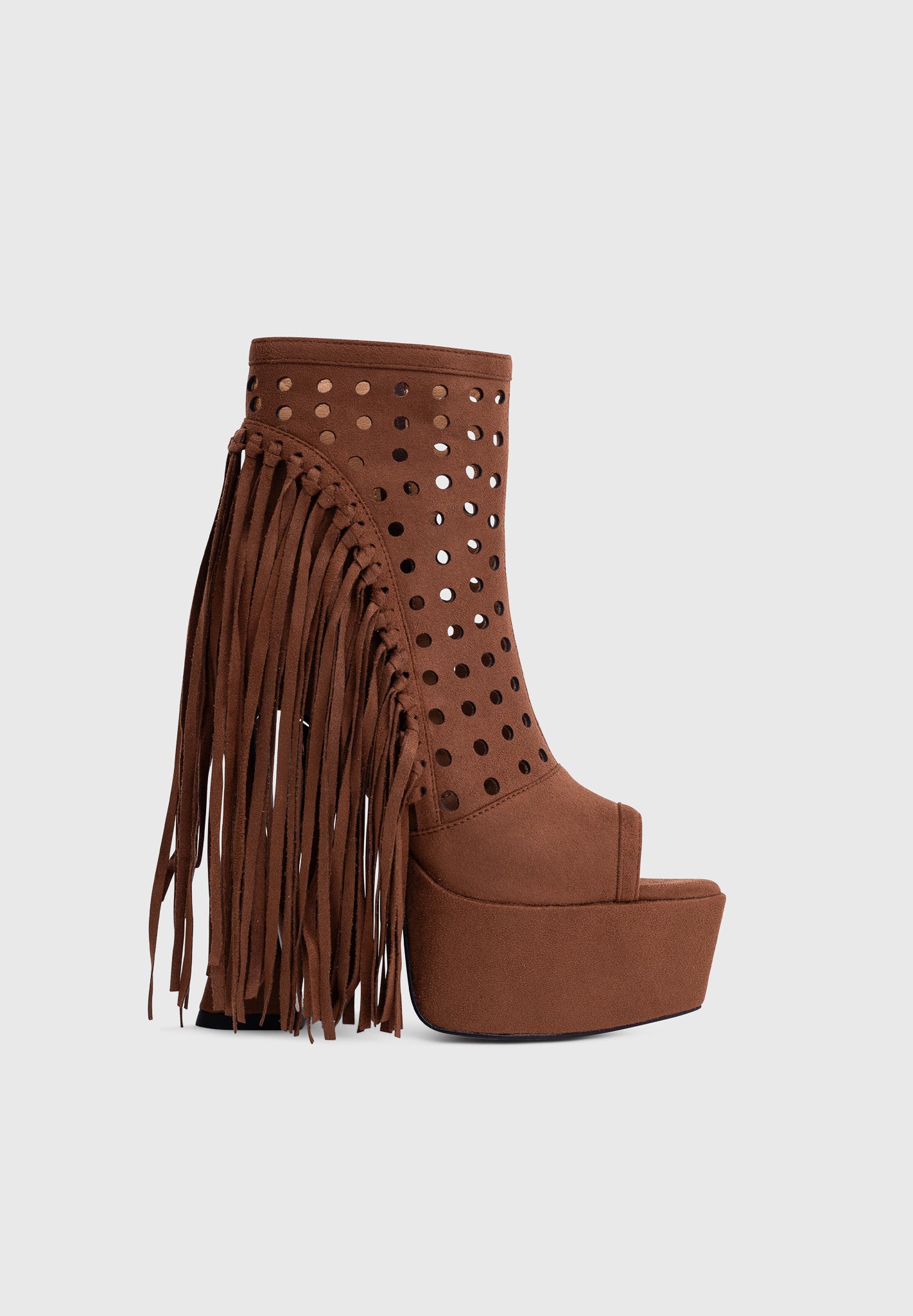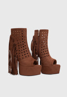 These platform ankle boots combine contemporary western style with the dramatic hourglass heel. The perforated upper adds lightness while the long side fringe creates movement and personality.