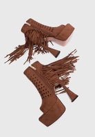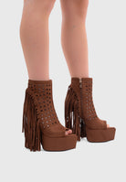 SAHARA Camel – Platform ankle boots with fringe and hourglass heel