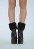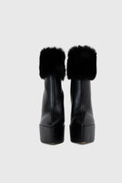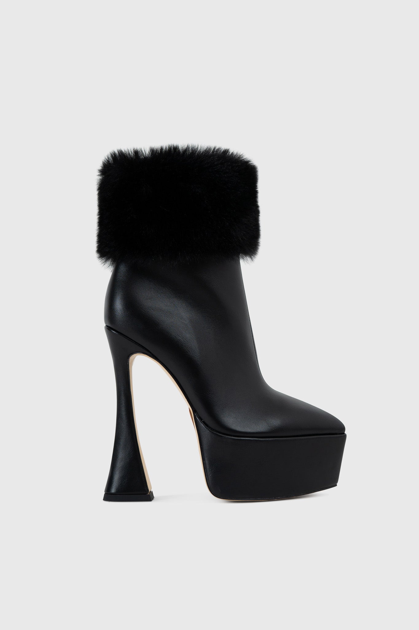 Uno stivaletto dal design scultoreo che unisce l’eleganza della similpelle nera premium al dettaglio glamour del bordo in eco-pelliccia, soffice e avvolgente. La silhouette è resa inconfondibile dal tacco a clessidra alto e dal maxi plateau, che slanciano la figura regalando una presenza scenica unica.