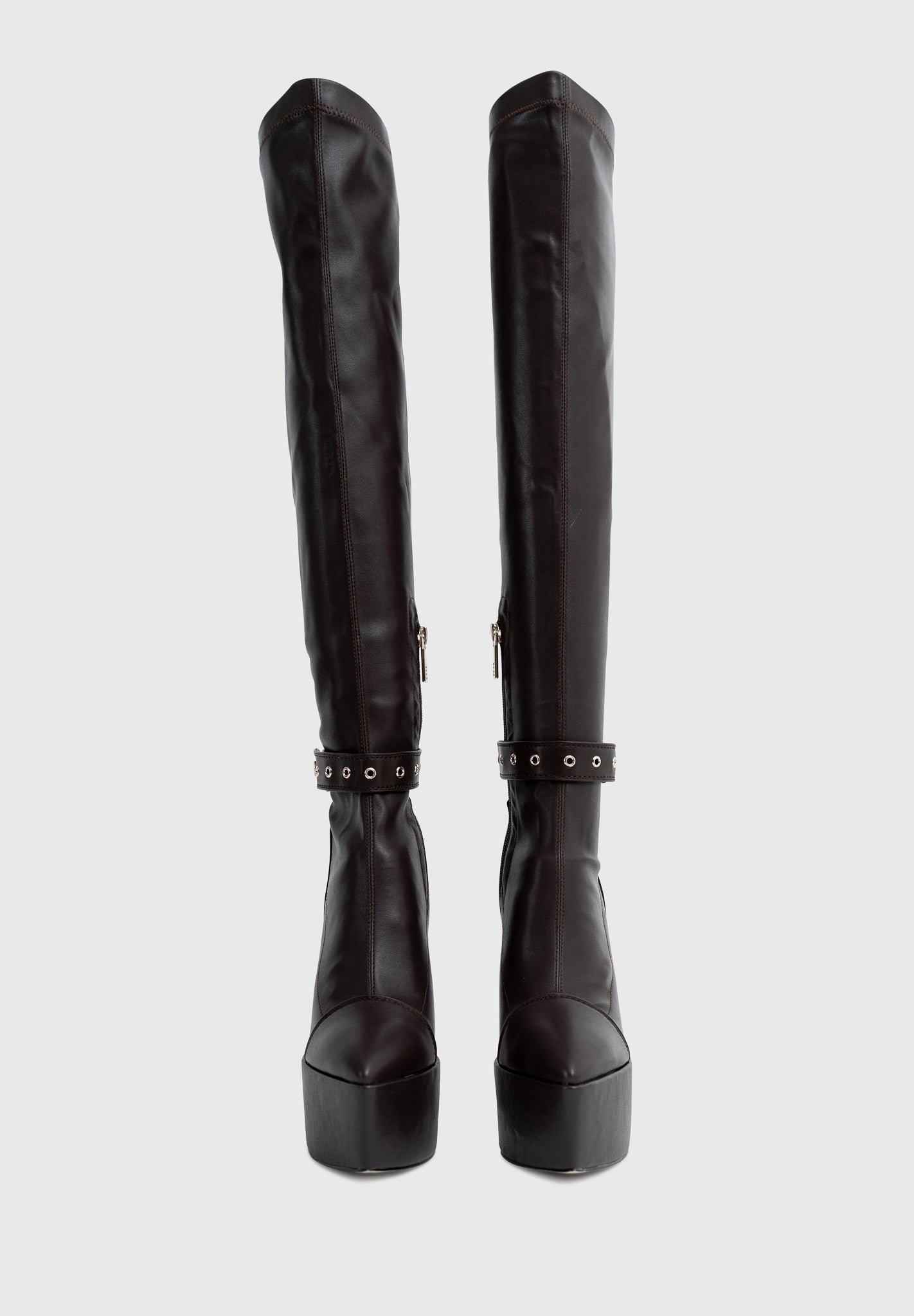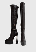 La tomaia in similpelle vegana nera avvolge la gamba come una seconda pelle, mentre il maxi plateau scolpito incontra il tacco a clessidra slanciato per regalare centimetri extra con una stabilità sorprendente.