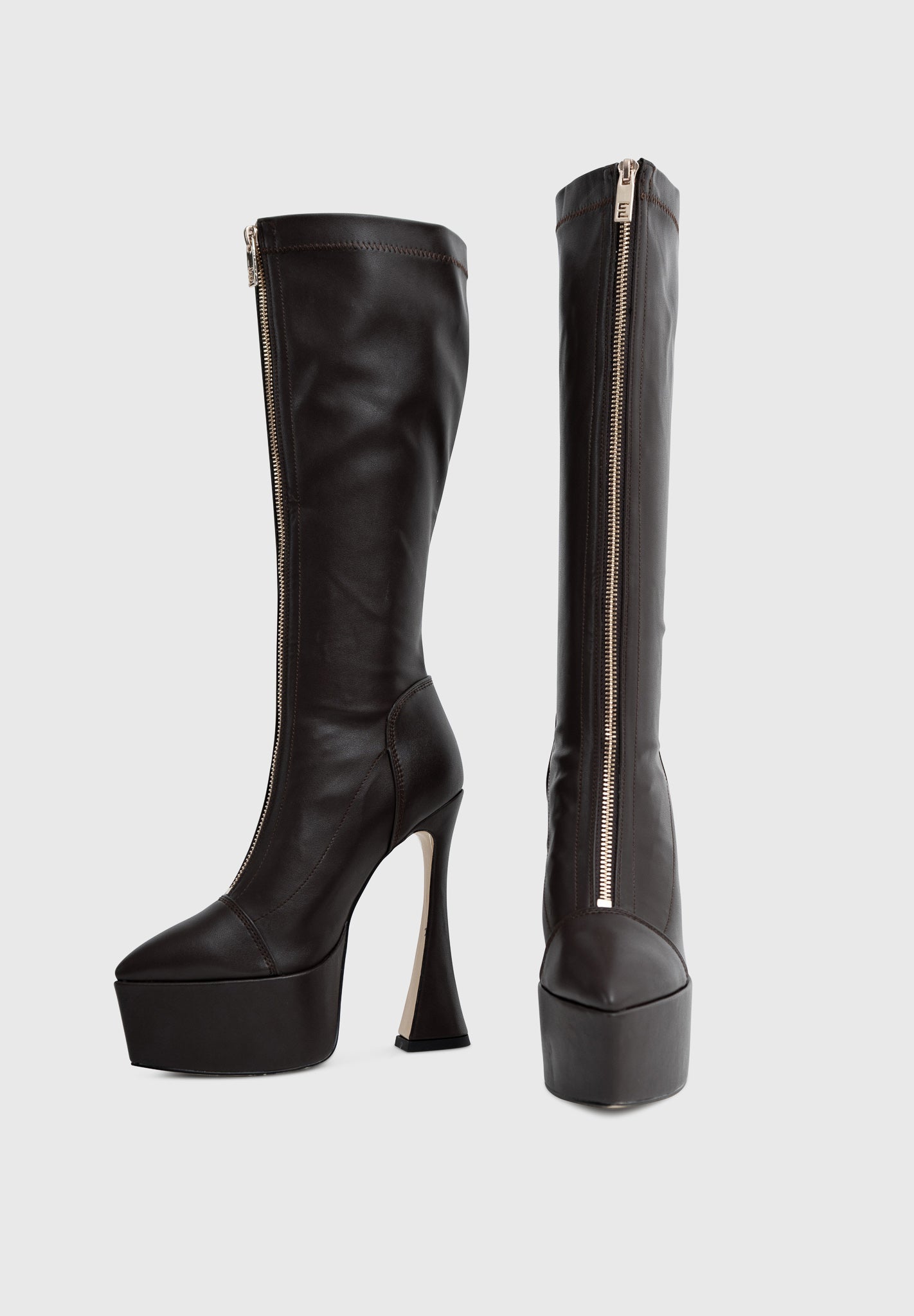 La punta affusolata incontra un maxi plateau ben bilanciato, mentre il tacco a clessidra scolpito regala centimetri e stabilità, trasformando la camminata in un gesto di stile.