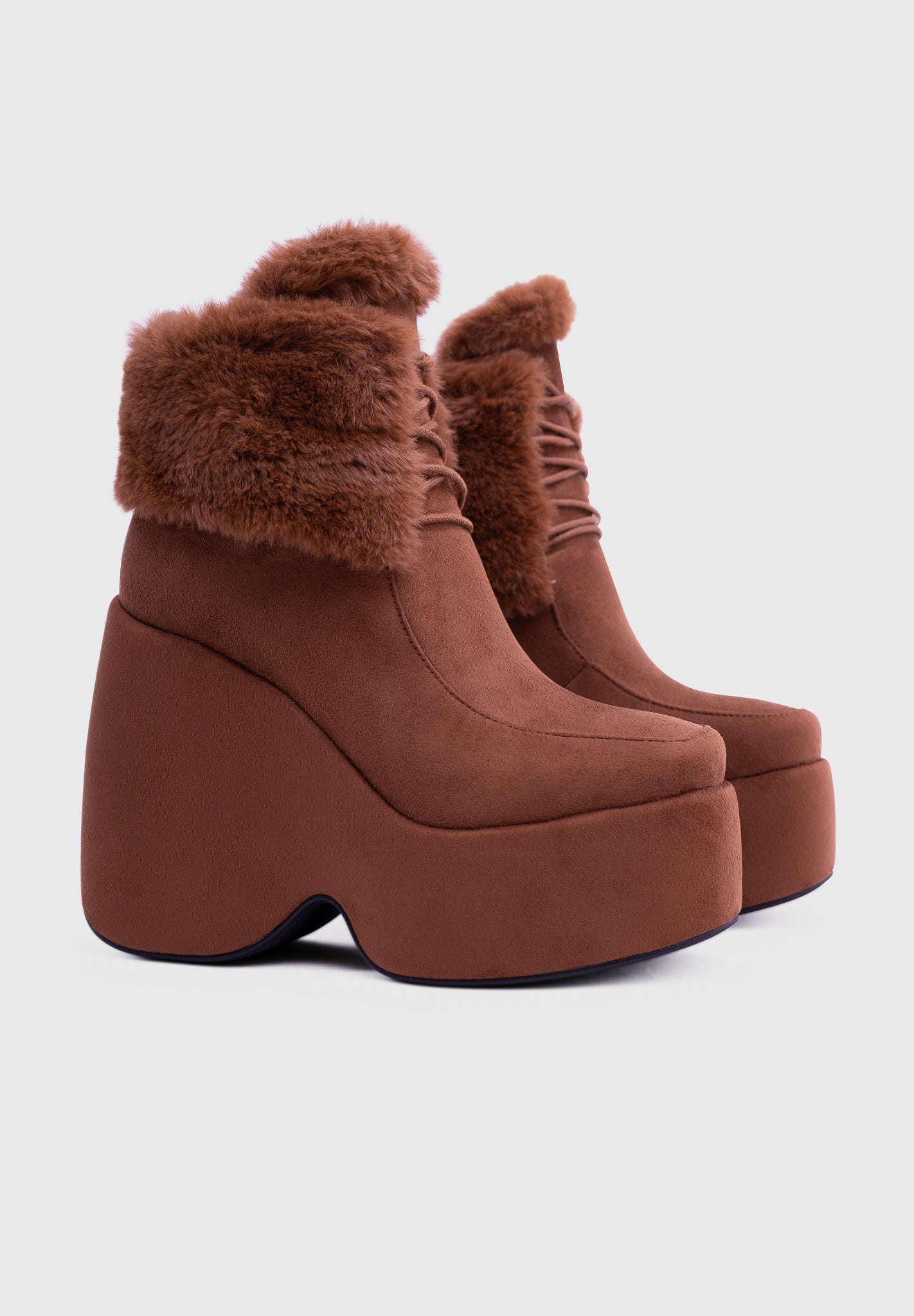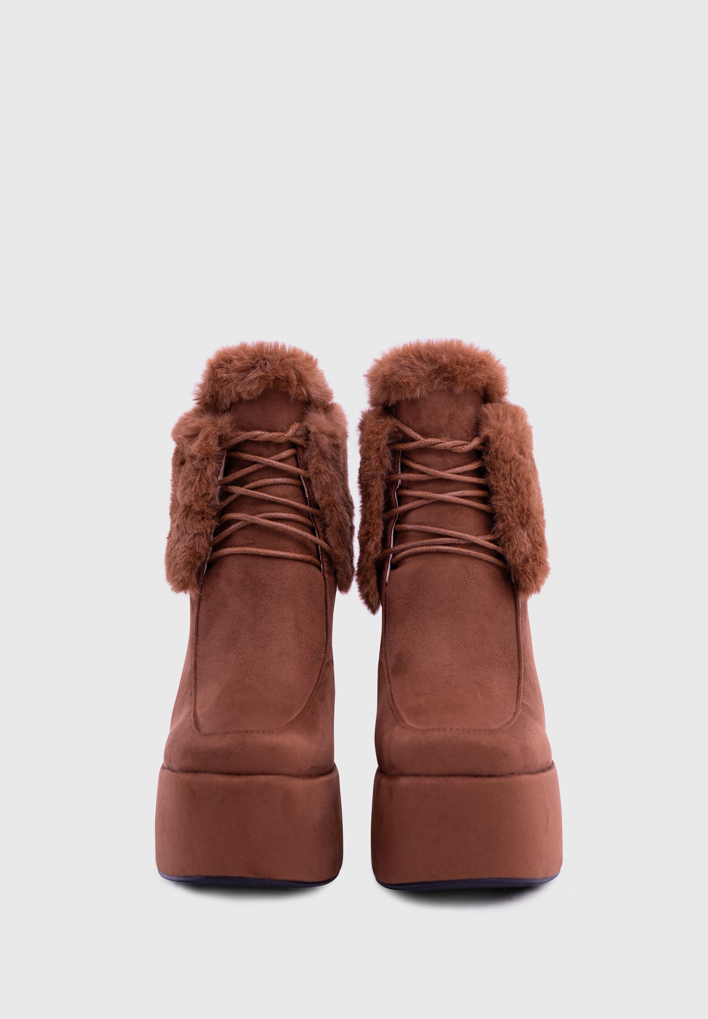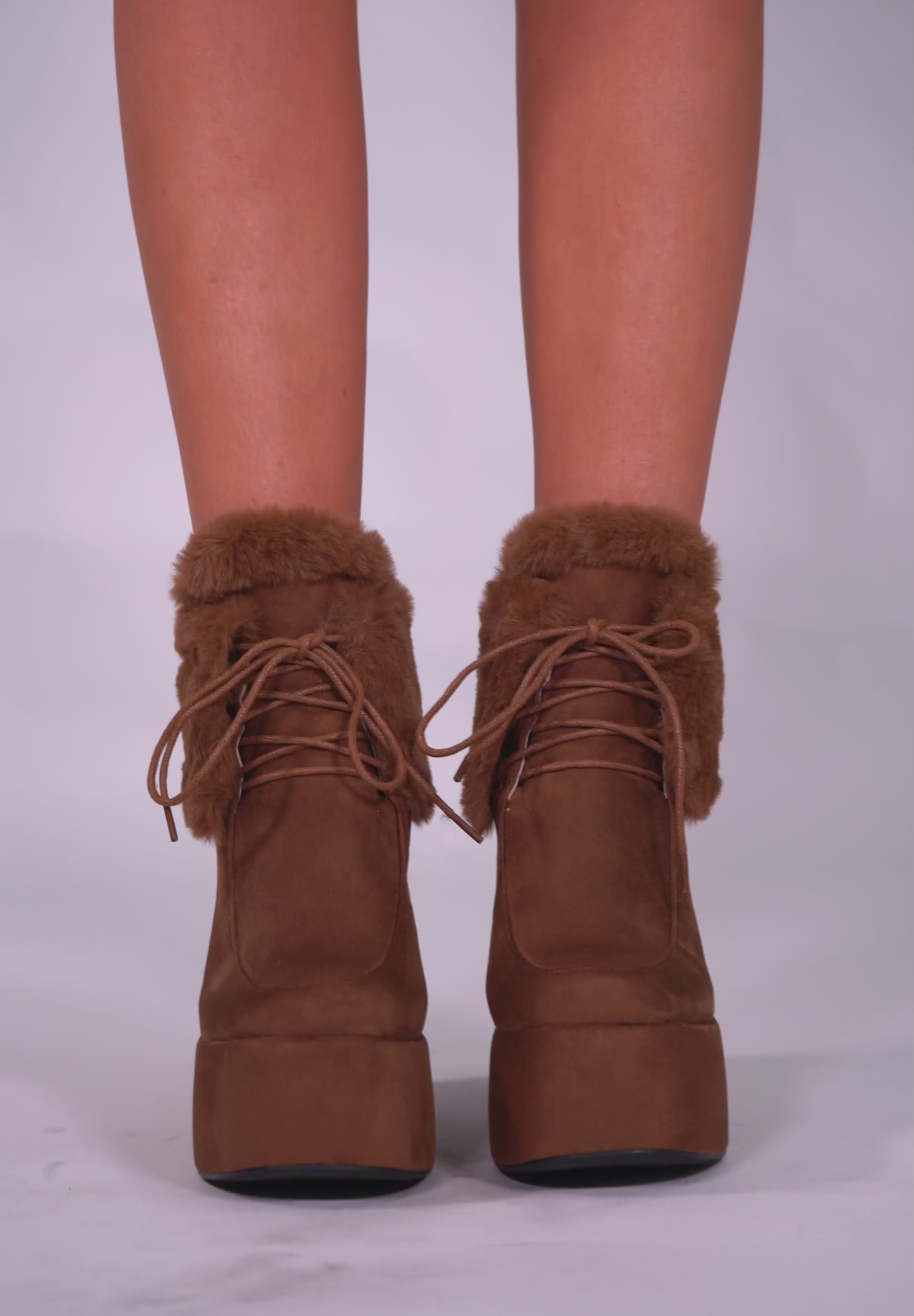 NOIRÉ Camel – Vegan suede platform ankle boots with laces and soft faux-fur collar