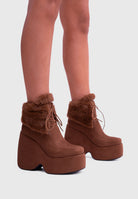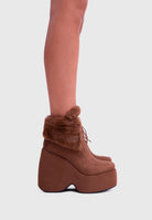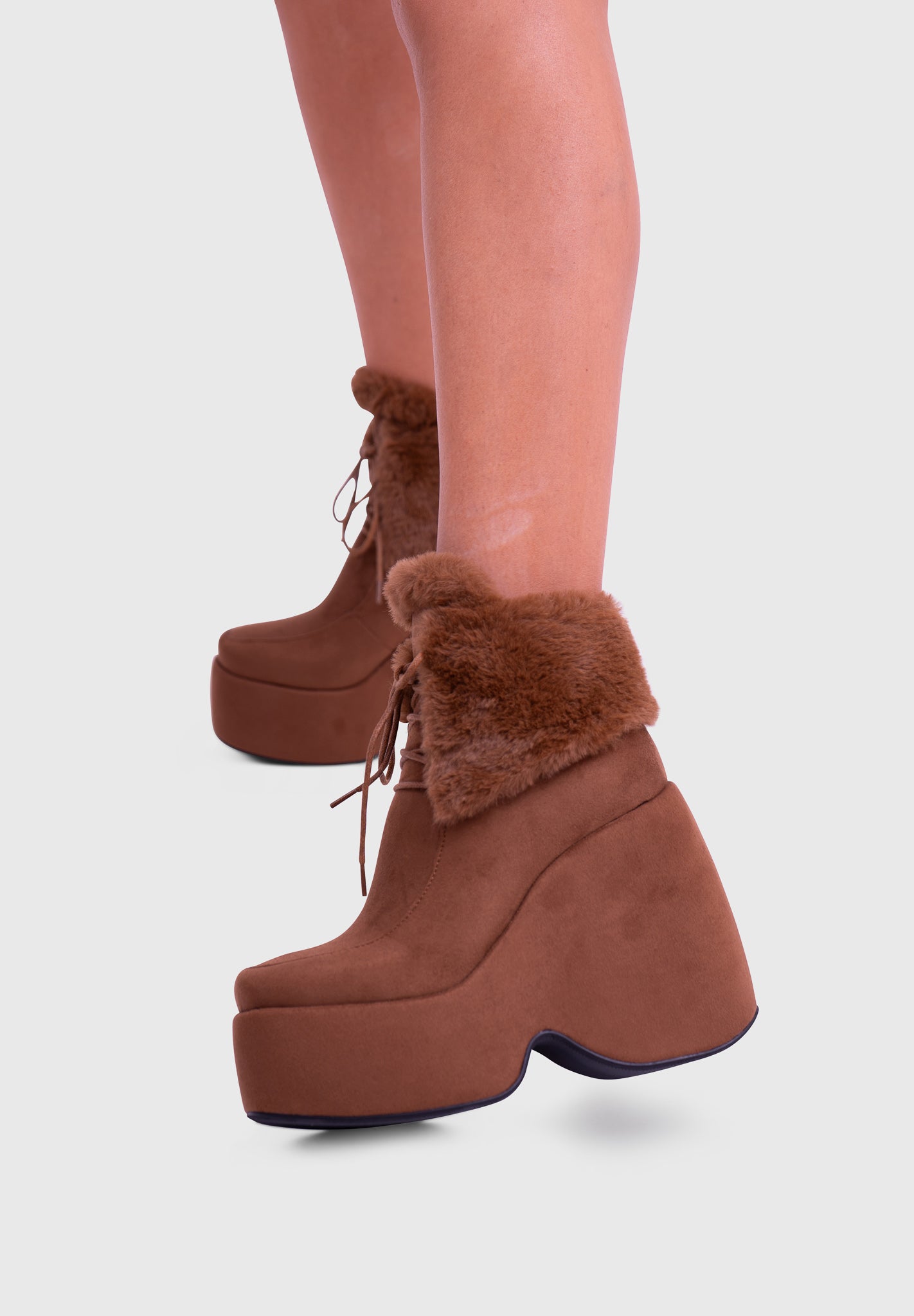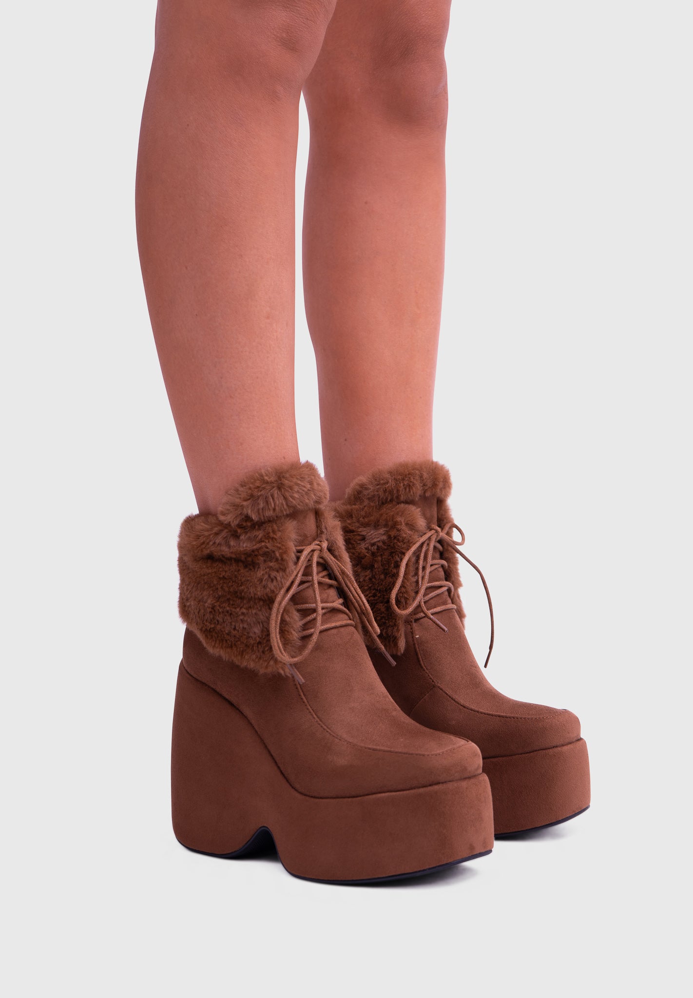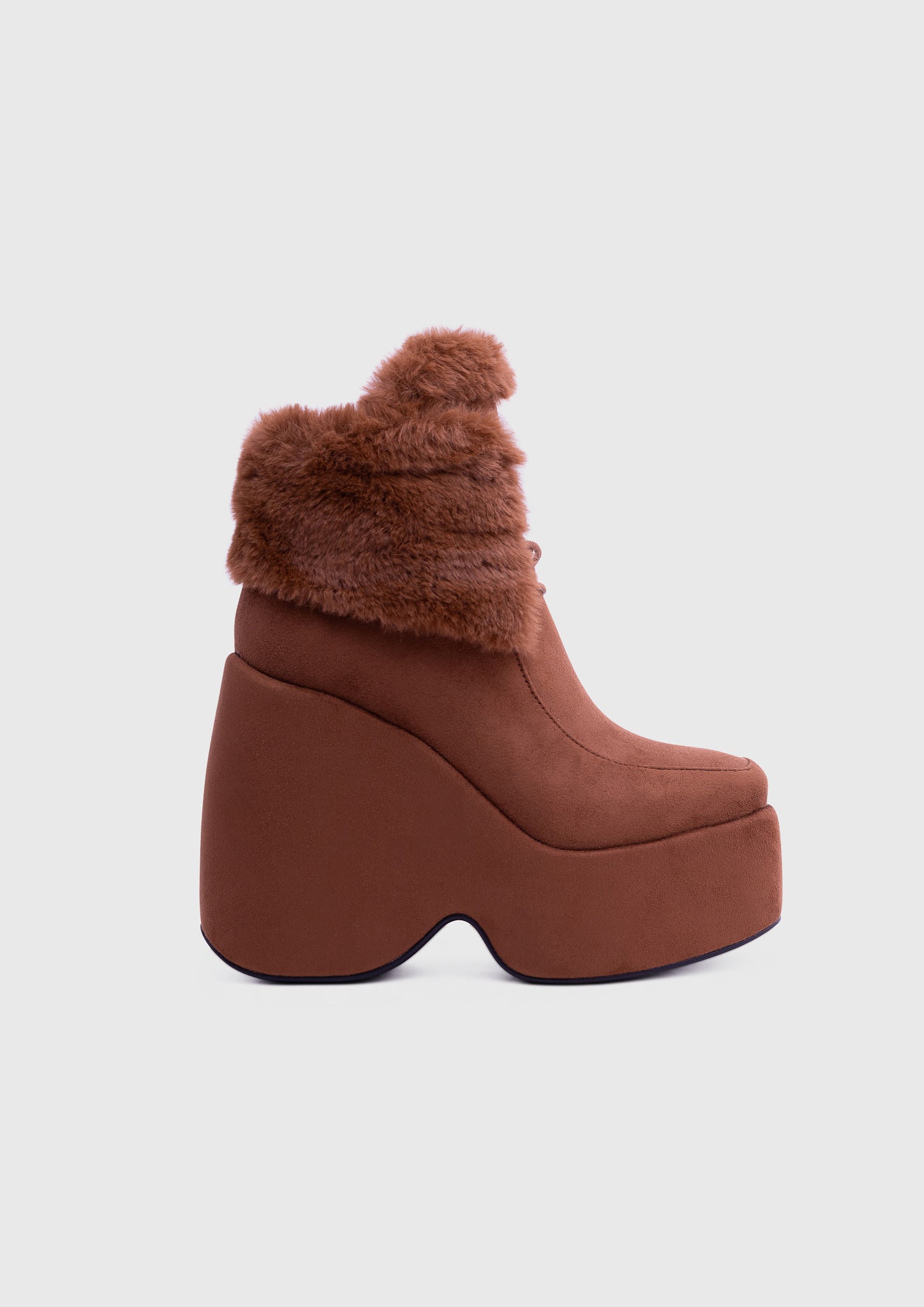 NOIRÉ Camel – Vegan suede platform ankle boots with laces and soft faux-fur collar