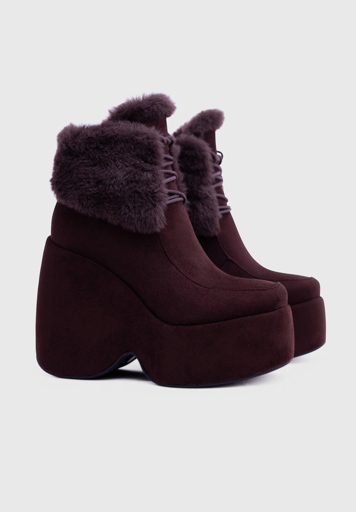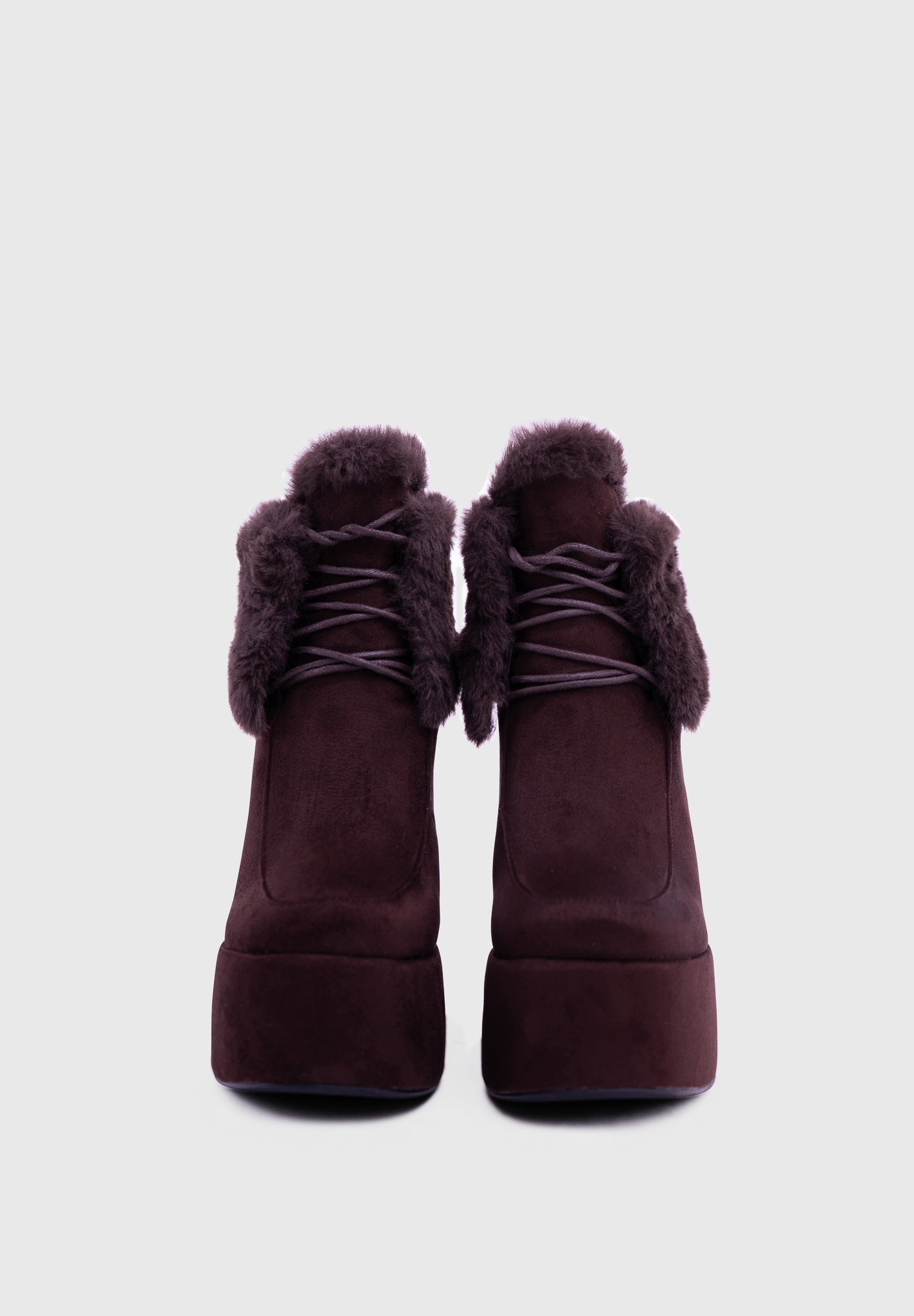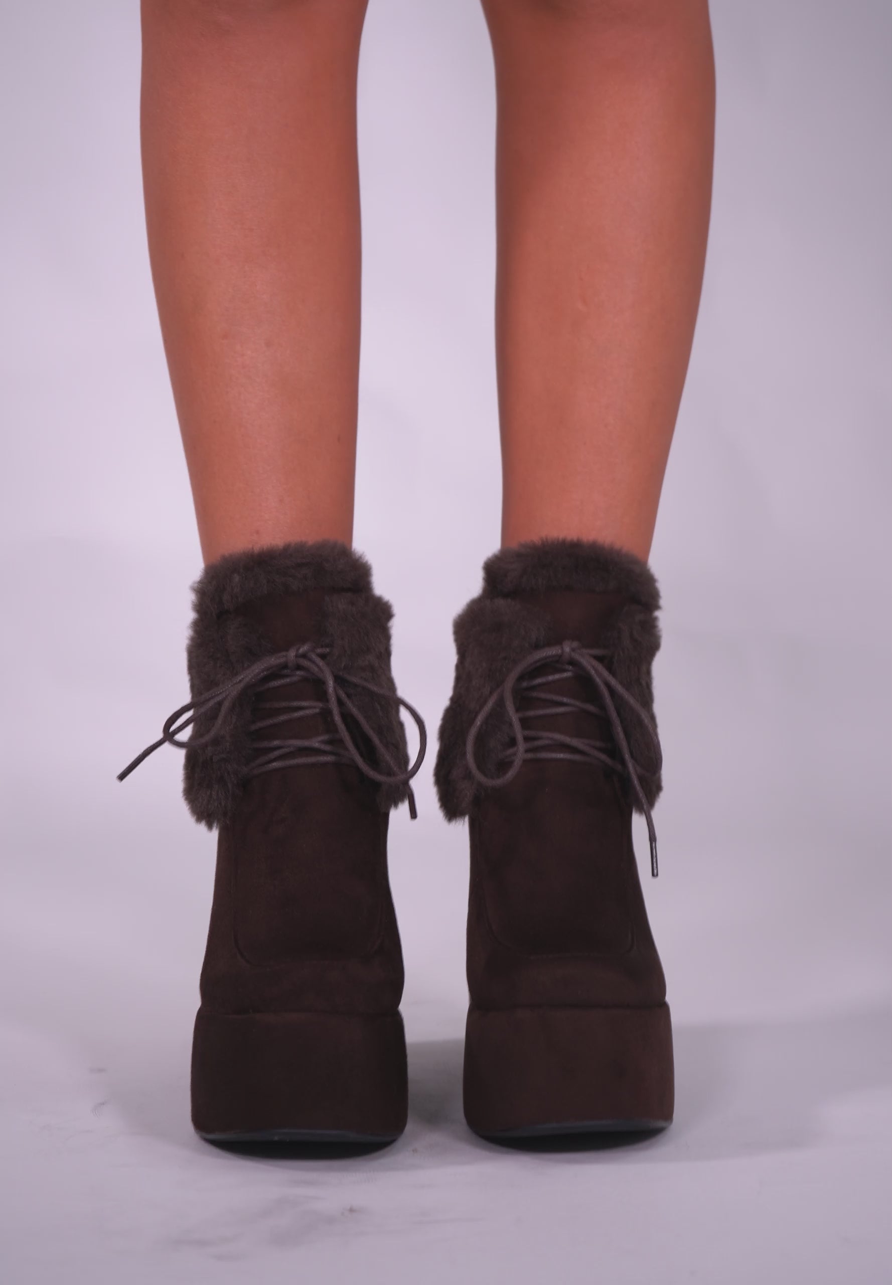 NOIRE Brown – Vegan suede platform ankle boots with laces and soft faux-fur collar