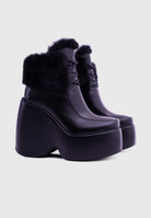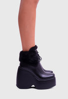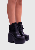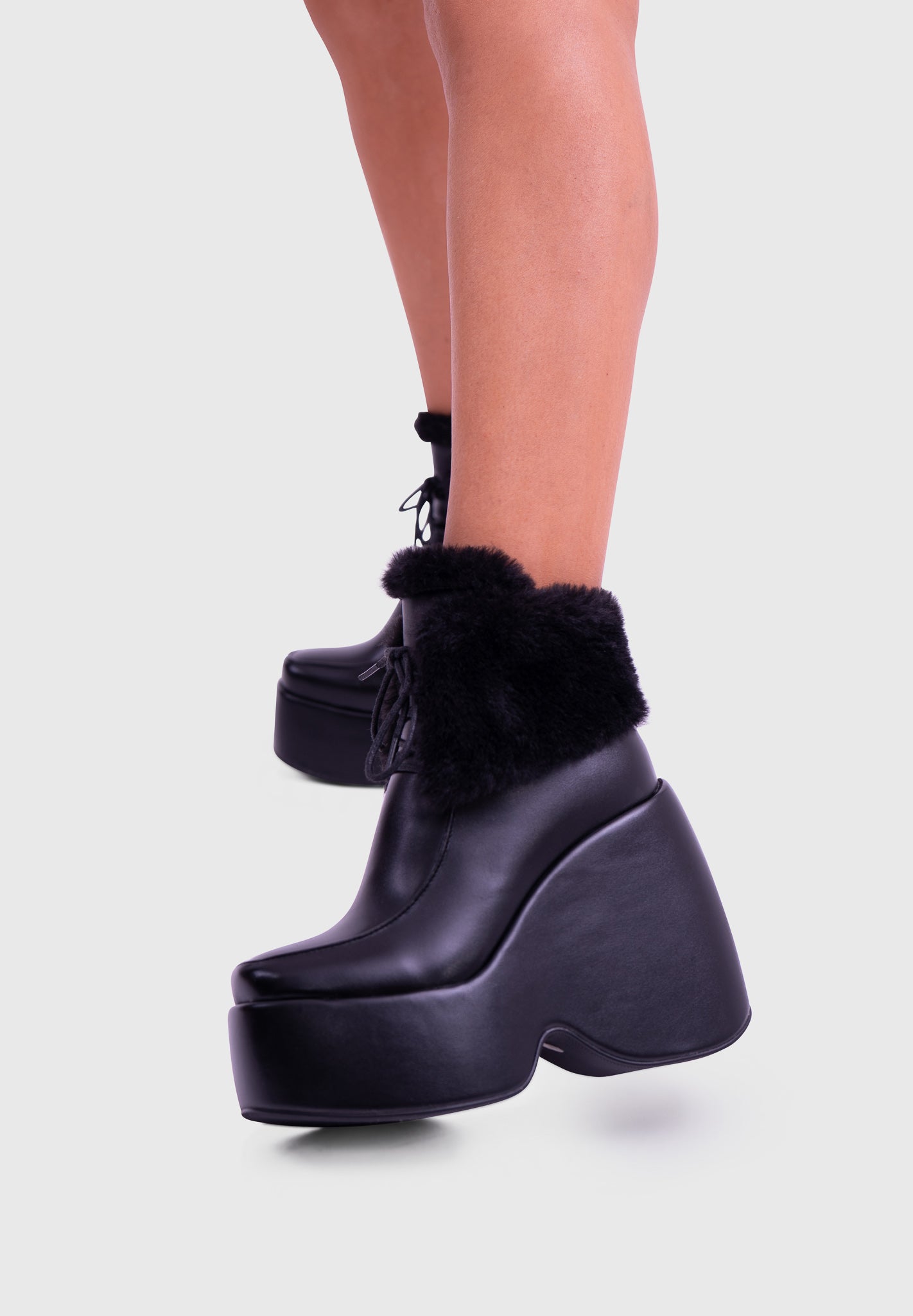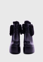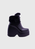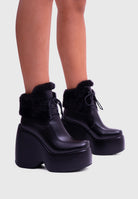 NOIRÉ Black Faux Leather – Platform ankle boots with laces and soft faux-fur collar