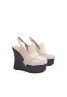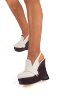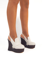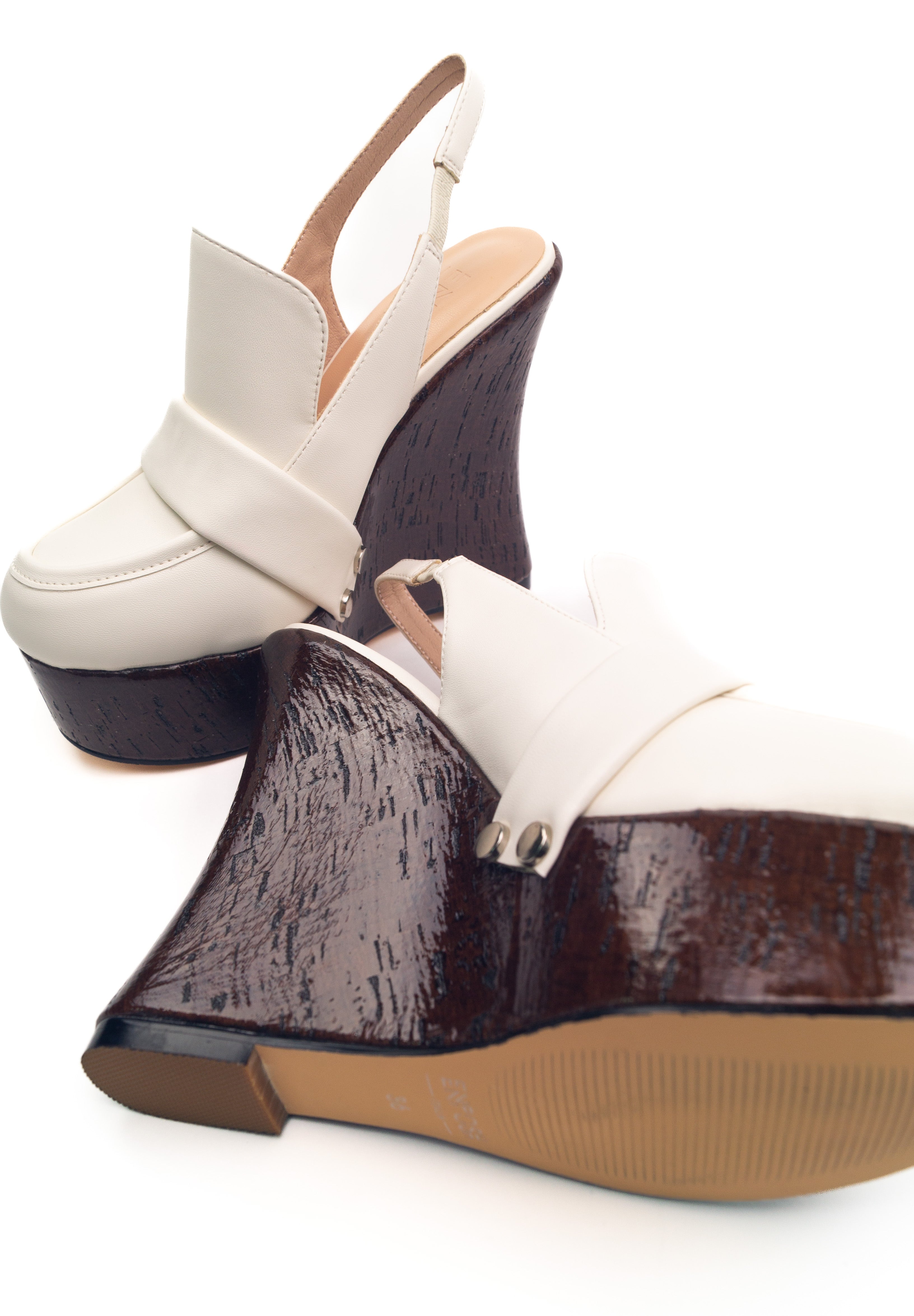 The lacquered wedge, contrast stitching, and golden hardware strike the perfect balance between boldness and femininity. The white color brings a polished touch to even the simplest outfit.