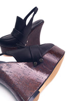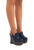 Featuring contrast stitching, a sculpted lacquered wood-effect wedge, and a pearl-accented buckle, it’s made for those who seek uniqueness. The black version is timeless and edgy — a must-have for bold dressers.