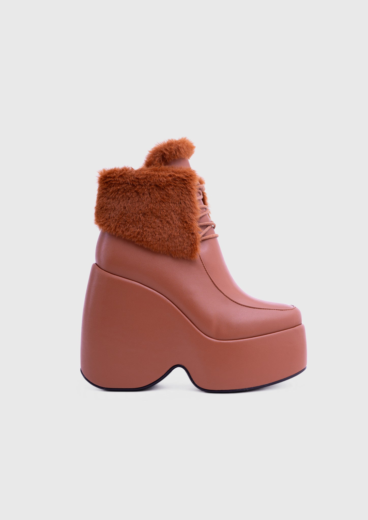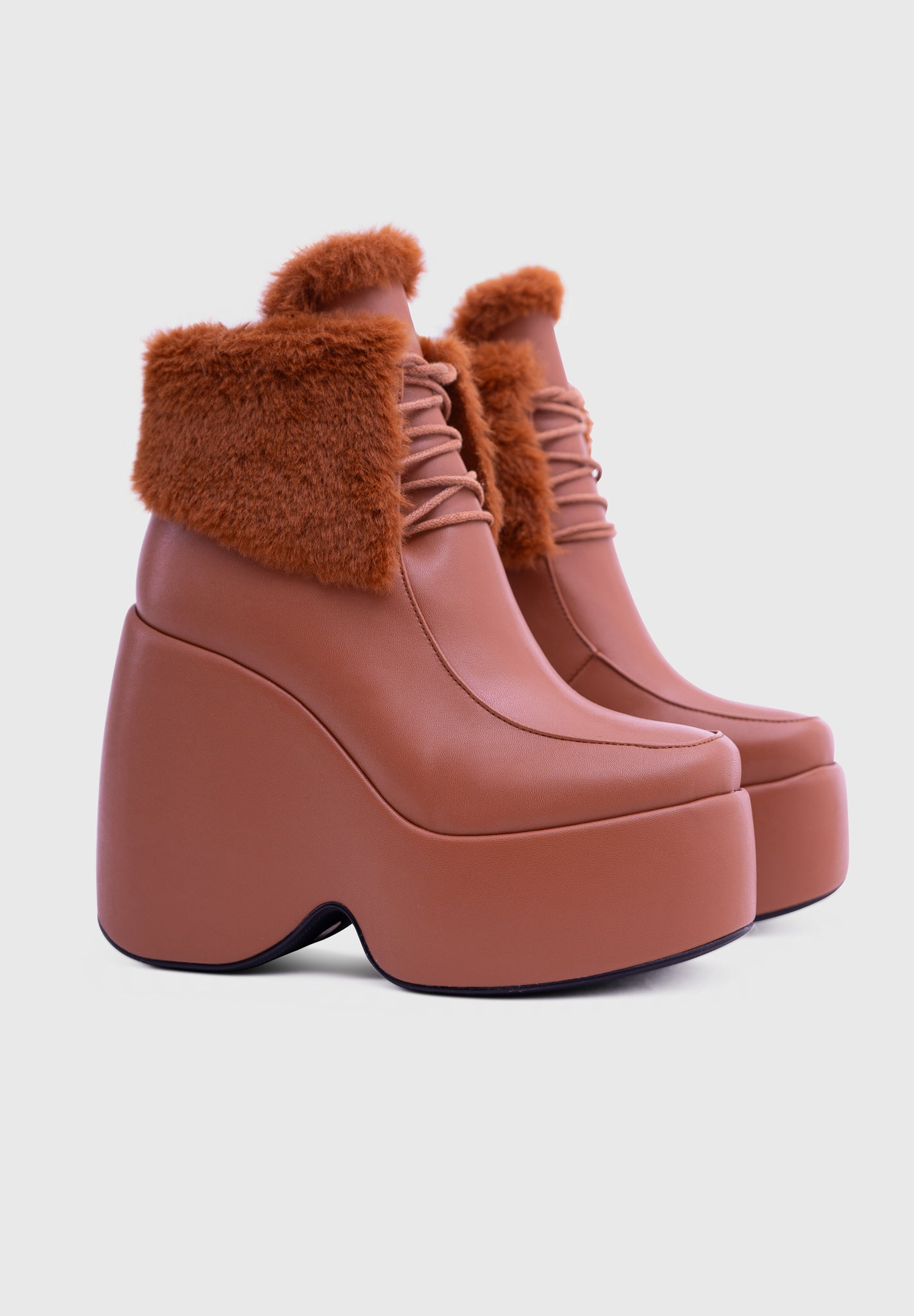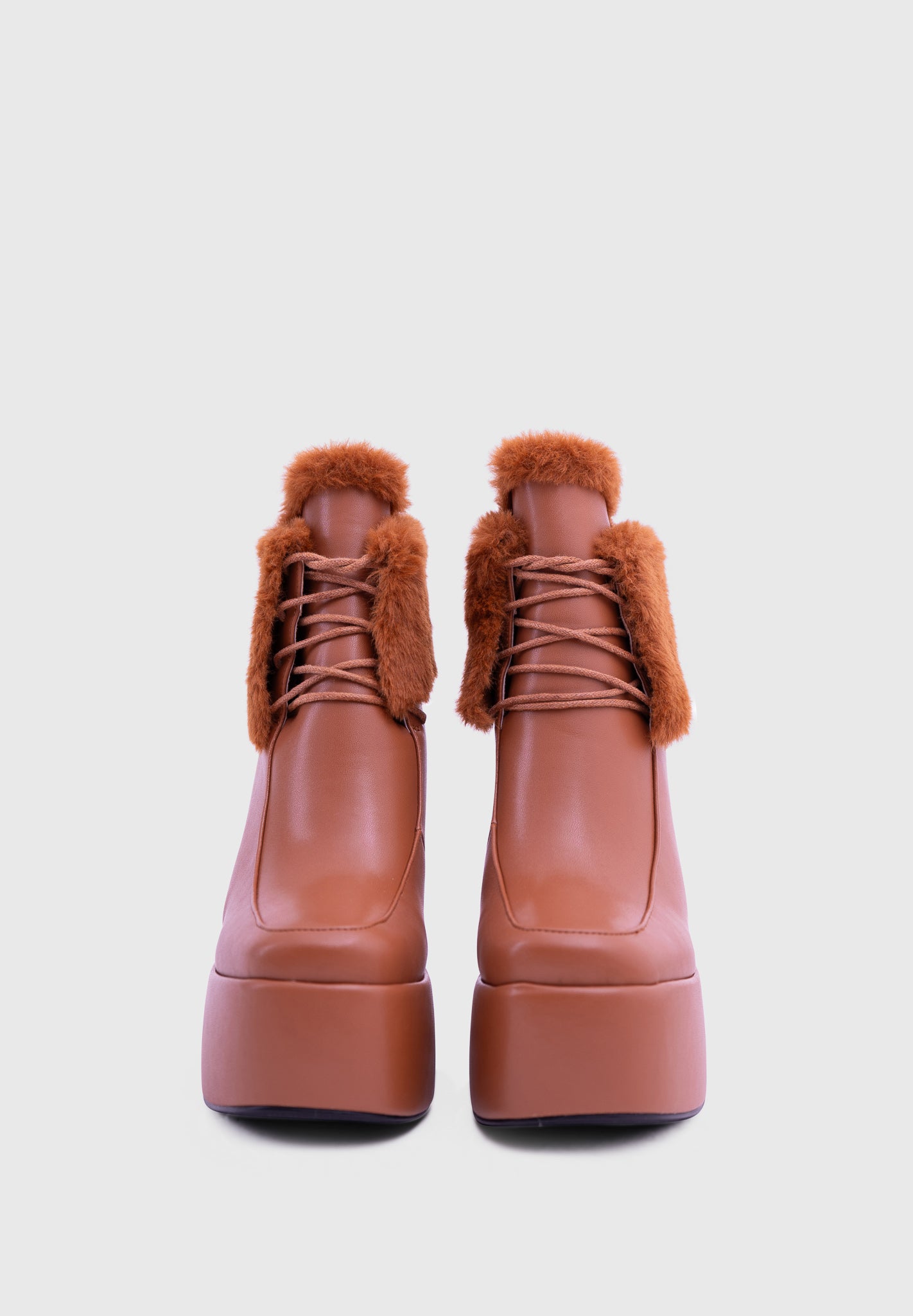 NOIRÉ Camel Faux Leather – Platform ankle boots with laces and soft faux-fur collar