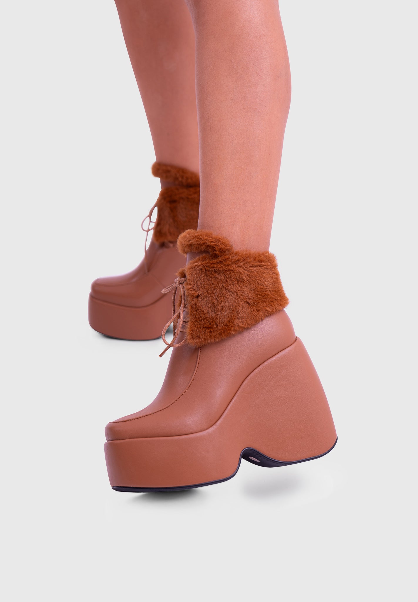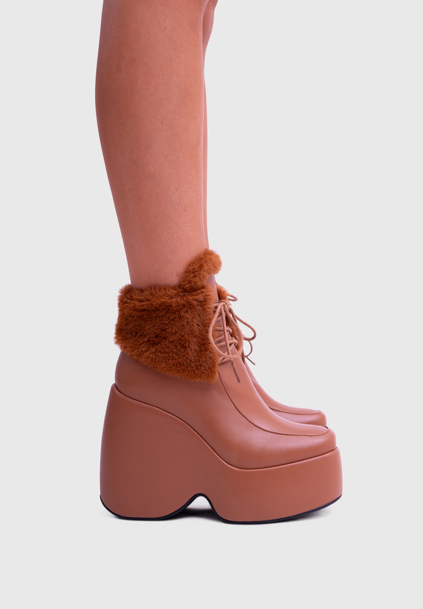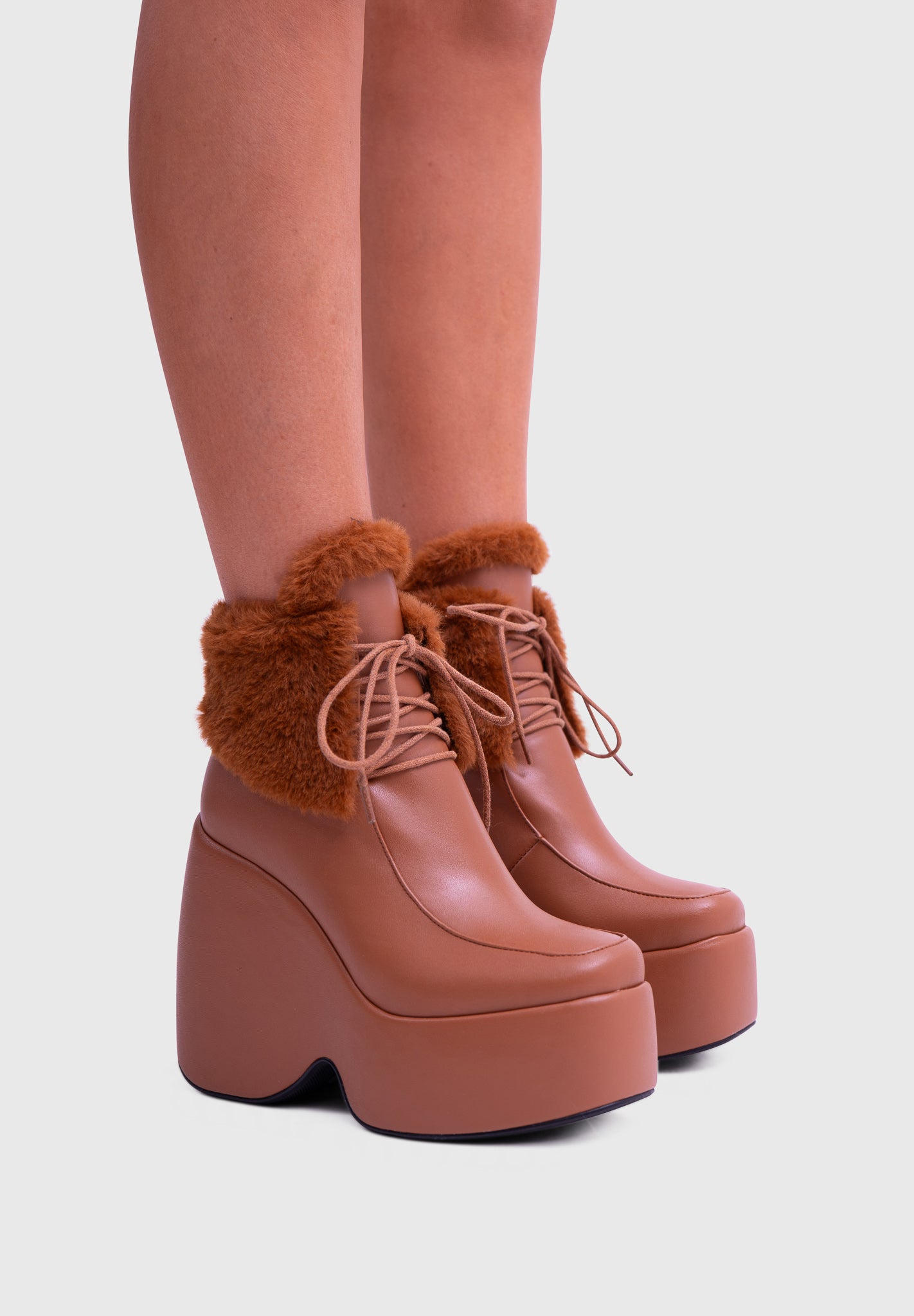 NOIRÉ Camel Faux Leather – Platform ankle boots with laces and soft faux-fur collar