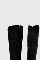 Il gambale in camoscio vegano è ricamato con motivi cowboy e impreziosito dal passante con borchia sulla parte alta, mentre il dettaglio in similpelle liscia scolpisce una linea pulita e sensuale. La punta addolcisce i volumi in armonia con il tacco alto a clessidra che, insieme al plateau, slancia la figura garantendo stabilità.